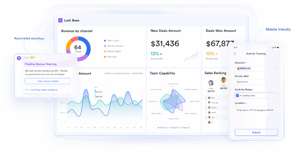 Custom tables track client requests, proof-of-concept progress, and dependencies. Automations send reminders when deadlines approach or when client input is overdue. For example, during a large enterprise pitch, Lark, working as a CRM app, can track technical evaluations across departments, link them to client milestones, and ensure handoffs happen smoothly. Leaders gain visibility, and sales engineers focus on solving problems, not chasing updates.